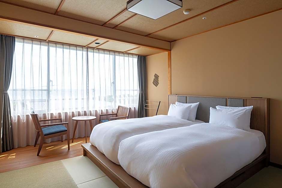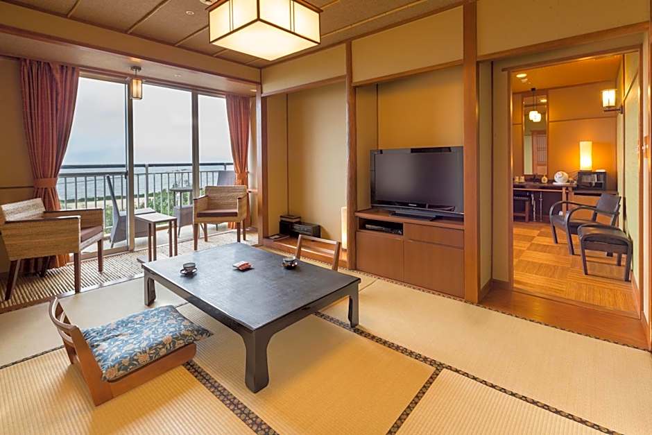 The private open-air bath is the standout feature of this twin room. The spacious air-conditioned twin room features a flat-screen TV, tatami, a seating area, a wardrobe as well as sea views. The unit has 2 futons.
