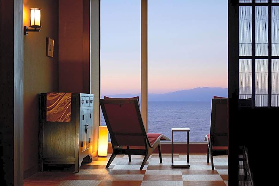 The private open-air bath is a top feature of this twin room. The spacious twin room features air conditioning, tatami, a balcony with sea views as well as a private bathroom boasting a bath. The unit has 2 futons.